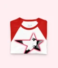 Manga raglan na vermelha, malha 100% algodão com estampa em serigrafia.